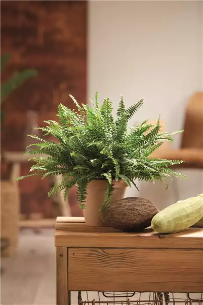 Zum Wintertrend „GREENERY“ gehören Farne unbedingt dazu. Sie sind echte Urpflanzen. Der Schwertfarn (Nephrolepis) ist eine der ältesten Pflanzen der Welt und wird oft als Fossil gefunden. Farne halten sich an einem feuchten Ort im Haus, wie zum Beispiel der Küche oder dem Bad, besonders gut.