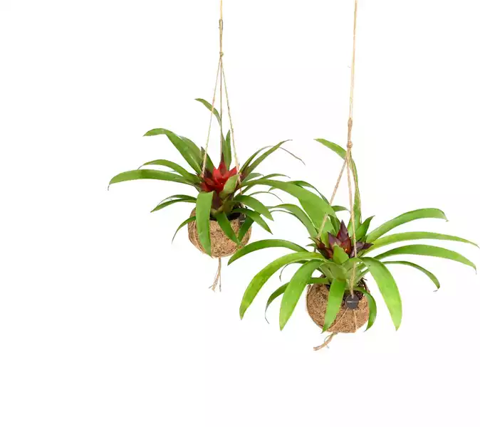 Der Kokodama Bromelie (Bromelia) eignet sich für einen hellen und warmen Standort, jedoch ohne direkte Sonneneinstrahlung. Bromelien sind südamerikanische Urwaldexoten, deren leuchtende Blüten mehrere Monate lang erstrahlen. Besprühen Sie die Bromelie leicht mit Wasser oder gießen Sie direkt in die Blattrosette.