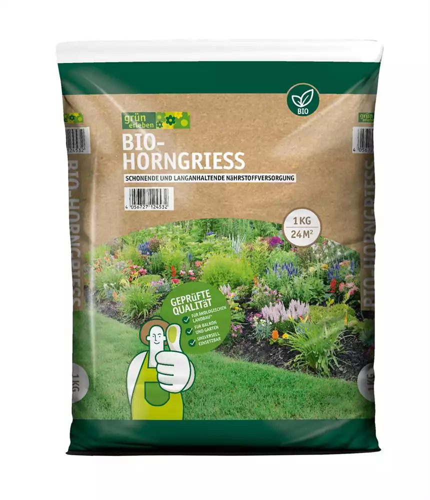 Grün erleben BIO-HORNGRIESS ist ein bewährter, rein organischer Naturdünger aus fein gesiebten Hornspänen und enthält ca. 14 % Stickstoff und ca. 85 % organische Substanz. Er eignet sich zur biologischen Startdüngung im zeitigen Frühjahr und zur Nachdüngung im Sommer. Damit erzielen Sie gesunde Pflanzen, reiche Ernten und wohlschmeckendes Obst und Gemüse. Er ist universell einsetzbar und kann zur Düngung von Gartenpflanzen wie Blumen, Stauden, Sträuchern, Nadelgehölzen, Hecken, Obst und Gemüse eingesetzt werden.