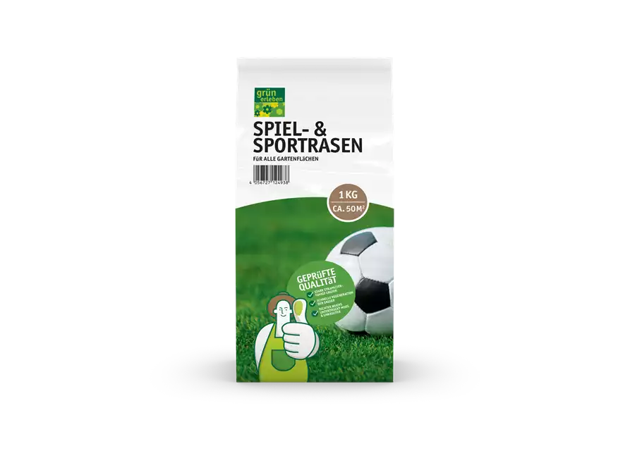 Grün erleben SPIEL- & SPORTRASEN ist bestens für Rasenflächen geeignet, die stark strapaziert werden. Dieser regenerationsfähige Rasen bevorzugt lichtreiche Standorte und wächst auf jedem Gartenboden. Er keimt schnell und gleichmäßig und ist bereits nach ca. 6 – 8 Wochen belastbar. grün erleben SPIEL- & SPORTRASEN ist pflegeleicht und widerstandsfähig gegen Rasenkrankheiten. Aufgrund seines dichten Wuchses verdrängt er Moos und Unkräuter.